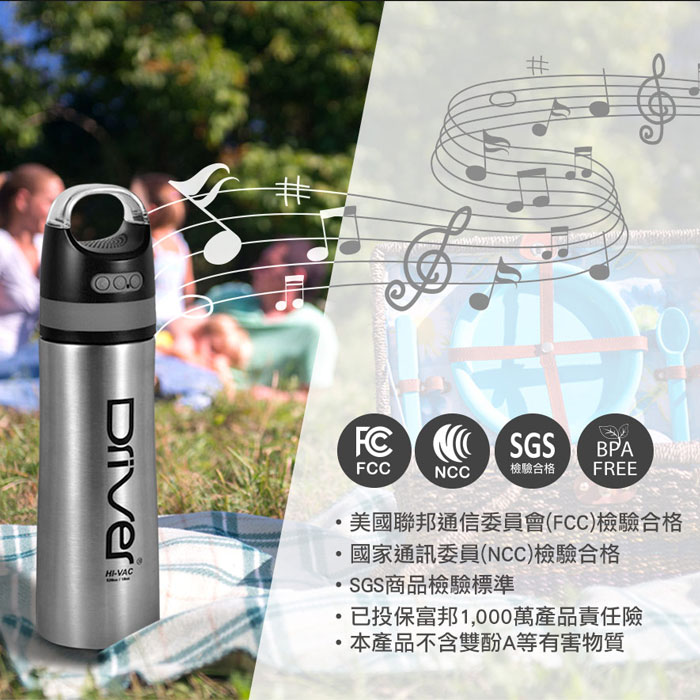 全球首創跨界藍牙保溫杯,將3C產品結合實用的冷熱兩用真空保溫瓶,為理性與感性兼具的實踐者,內建接聽來電麥克風,可做通話功能使用,使用普通音量可維持4小時的播放,提把閃光燈設計,隨著音樂變化色彩,可隨意開啟關閉,藍牙杯蓋設有USB插孔,可為藍牙音樂保溫杯充電,本系列產品採SUS316優質不鏽鋼,不含重金屬、雙酚A有害物質,本產品符合美國聯邦通信委員會(FCC)檢驗合格、國家通訊委員(NCC)、SGS商品檢驗標準。