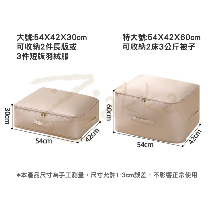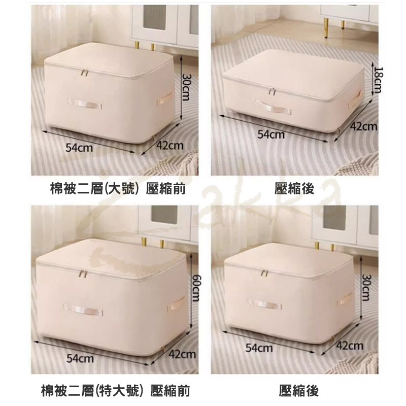 棉被收納袋:壓縮後尺寸長54 x 寬42 x 高30 cm(大號)、長54 x 寬42 x 高60 cm(特大號)、