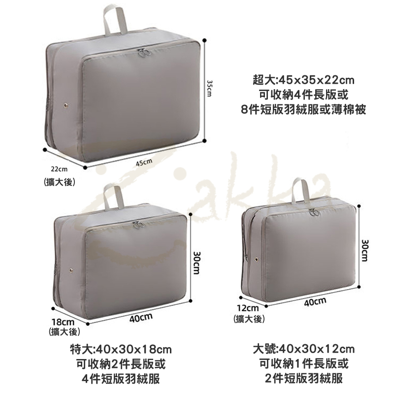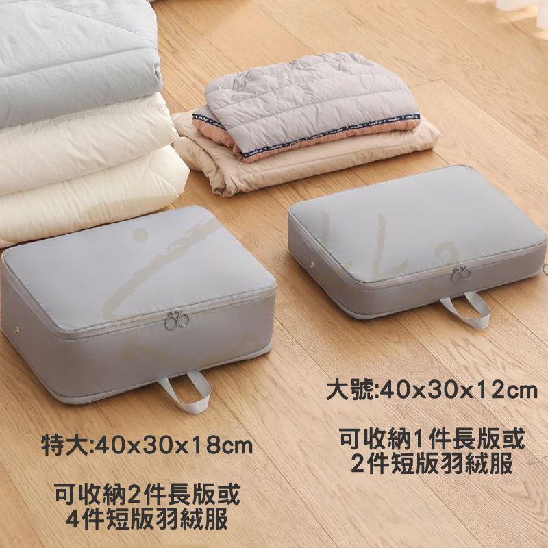 衣物收納袋:壓縮後尺寸長40 x 寬30 x 高12 cm(大號)、長40 x 寬30 x 高18 cm(特大號)、