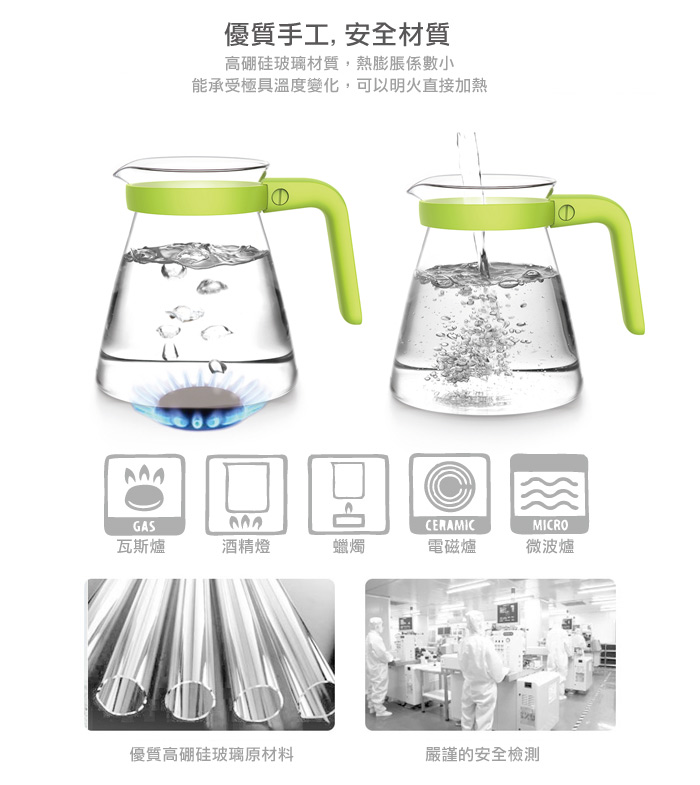 * 產品採用高硼硅玻璃,可用煤氣爐、酒精爐、蠟燭、電陶爐、微波爐加熱。